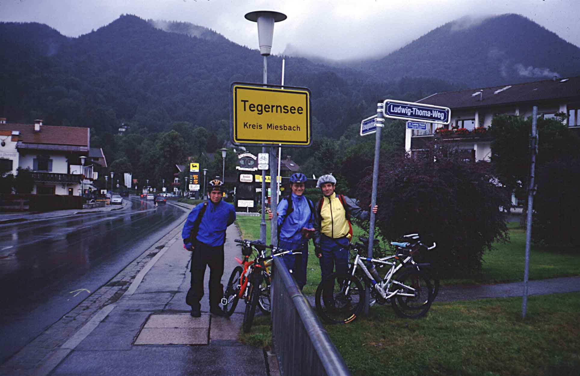 Frisch gestärkt und gut verpackt führt uns die Rottach auf Asphalt bis Enterrottach. Praktischerweise brauchten wir nur den Pfeilen des Tegernseemarathons zu folgen, unpraktischerweise regnet es immer heftiger und das GPS streckt alle Viere von sich. Ist aber auch nicht notwendig, da der Weg bis zur Monialm ausgeschildert ist. Am Beginn des Schotters lässt der Regen endlich nach, es ist aber immer noch reichlich feucht.