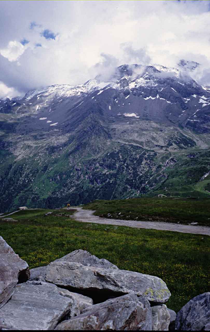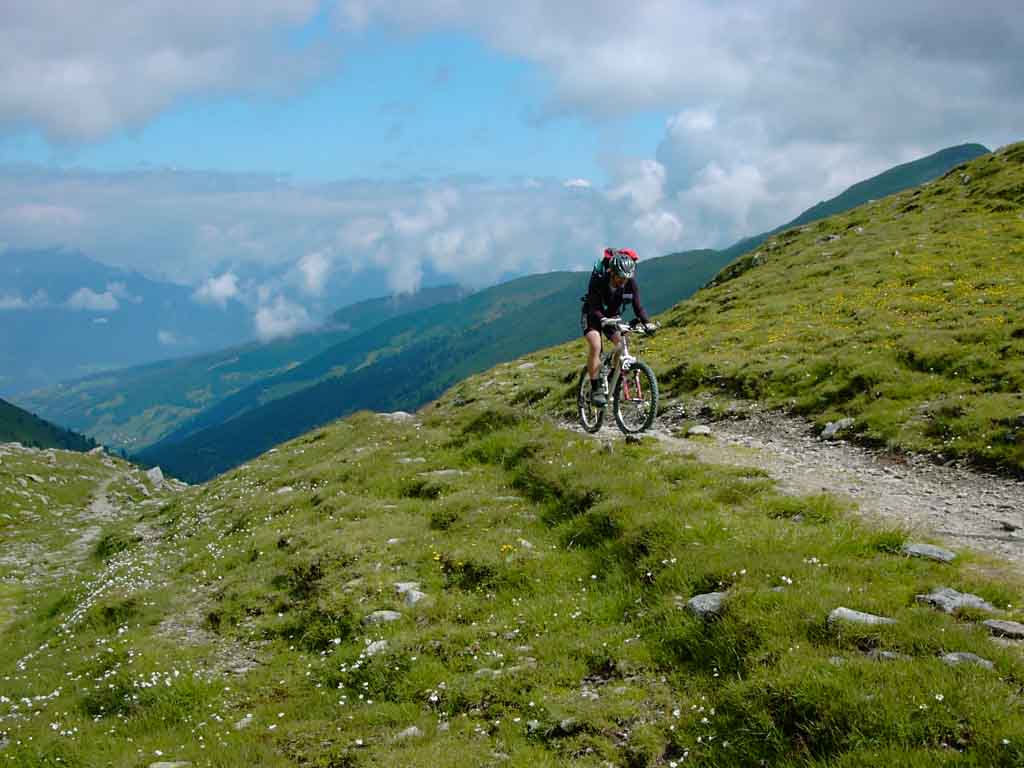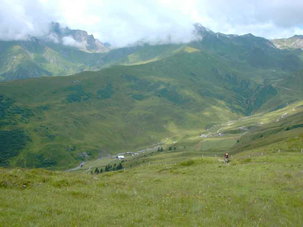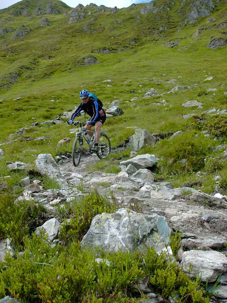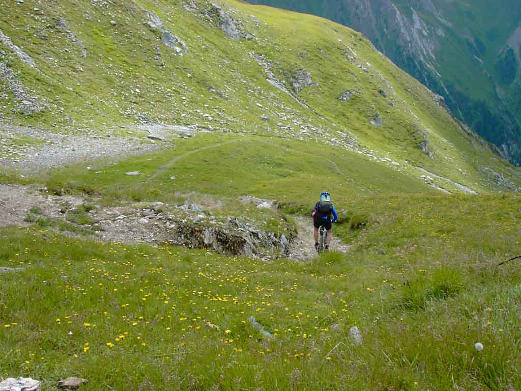 Am Joch ist es reichlich windig, die Aussicht stark eingeschränkt, also schnell wieder runter. Leider sind wir den Wanderwegmarkierungen über die Kuhwiese gefolgt und haben nicht einfach rechts den Weg am Hang gewählt, dieser führt zu der einfachen Schotterpiste ins Tal. Der direkte Weg über die Wiese war eher eine Schiebung über zerfurchte Wegspuren als eine vernünftige Trailabfahrt.