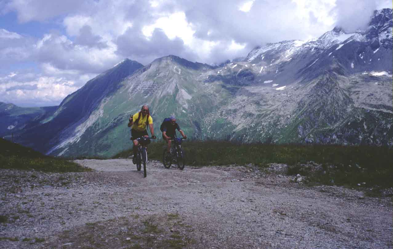 Ich habe freundlicherweise kurz vorm Joch auf den Rest der Mannschaft gewartet und so wurde die Mannschaftswertung ohne Konkurrenz gewonnen. ;-). Das Panorami ringsrum ist recht nett, wird allerdings durch den Blick auf das Gletscherskigebiet etwas getrübt. Egal, vor uns liegt ein Traumtrail bergab, ist zu einem großen Teil fahrbar, nur ein paar Passagen und ein Stück im Wald sind besser schiebbar. Der Weg soll inzwischen ausgebaut worden sein.