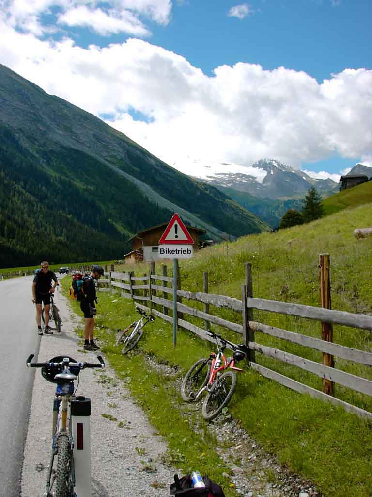 Ab Stafflach gehts nach Gries am Brenner und wir biegen in ein Seitental Richtung Obernberg ein. Wir sind gut in der Zeit und so wird beschlossen bis zur Sattelalm zu fahren. Vorsicht bei der Auffahrt zur Alm, nicht dem ausgezeichneten Wanderweg folgen, sondern ein paar Meter weiter in die gut fahrbaren Forststrasse einbiegen. Dies bedeutet zwar noch ein paar Höhenmeter am Ende des Tages, dafür können wir am nächsten Morgen die Erstürmung der Brenner Grenzkammstrasse ruhig angehen können.