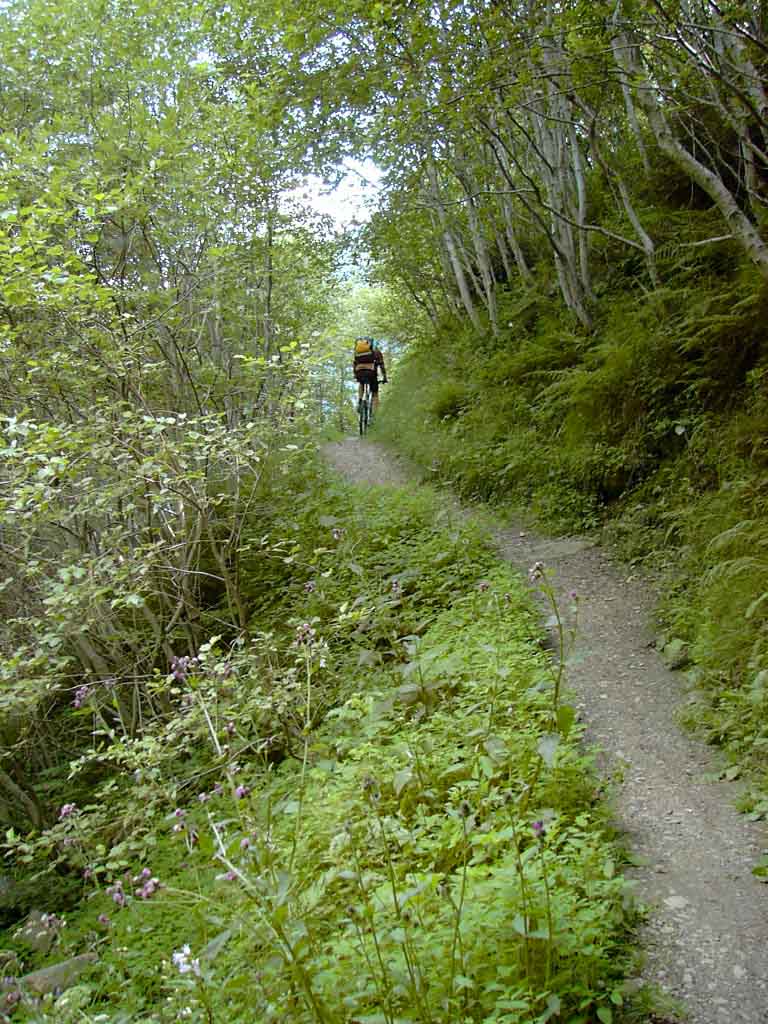 Wer sich auf einen lockeren Start des Tages gefreut hat, hat Pech gehabt. Der Trail Richtung Kammstrasse zeigt schnell seine Zähne und erfreut durch heftige Prozente. Apropo Zähne, mit dem bekannte Bauern, der ungern Radfahrer auf seinem Grundstück sieht, hatten wir keinen Kontakt. Inzwischen hat der Wirt der Sattelbergalm eine Ausweichstrecke geschoben, die allerdings zu einem Großteil nur schiebbar ist.