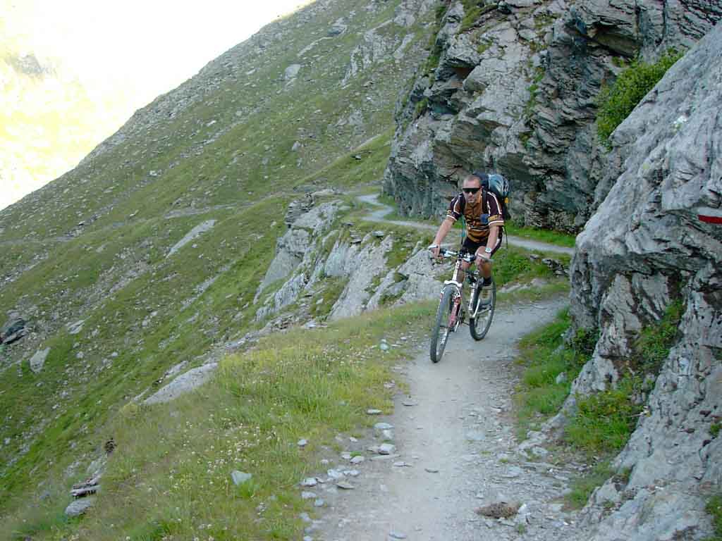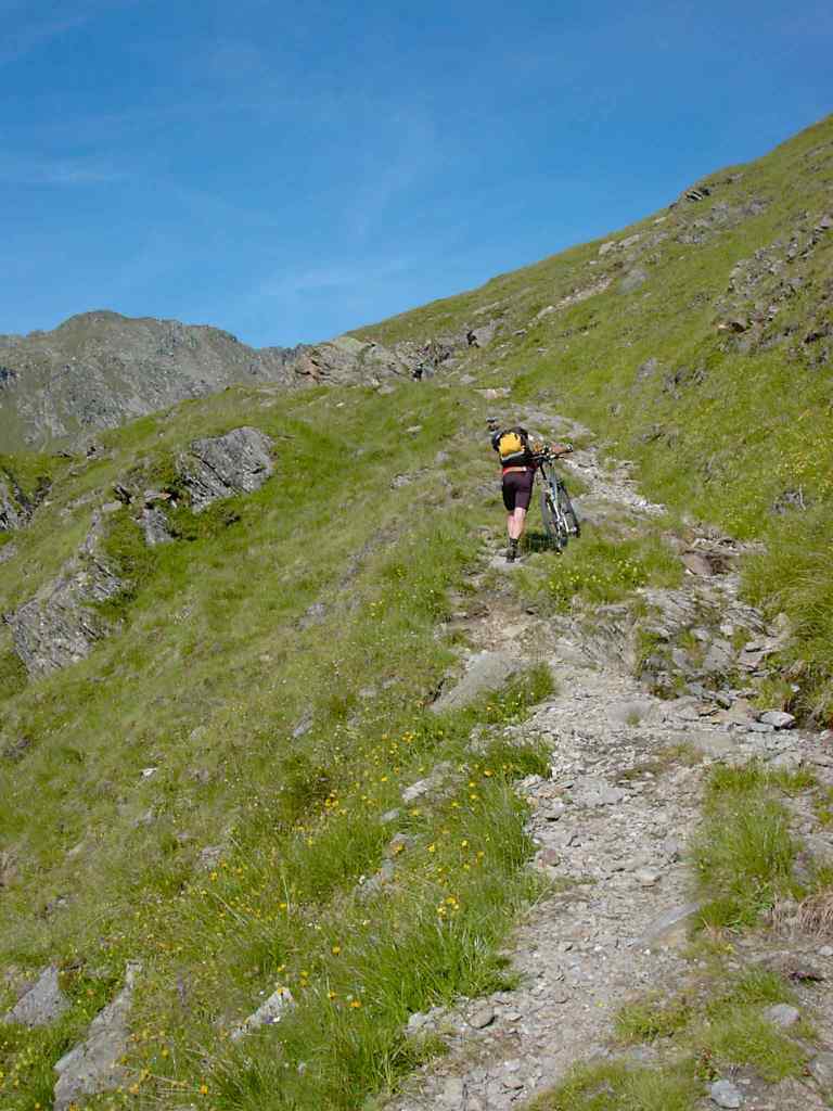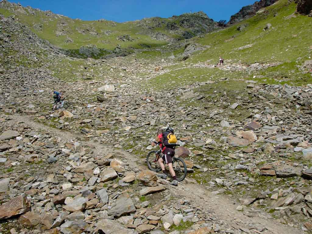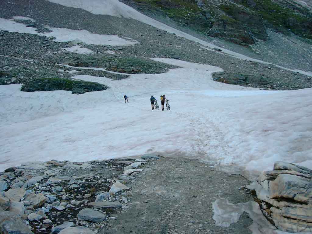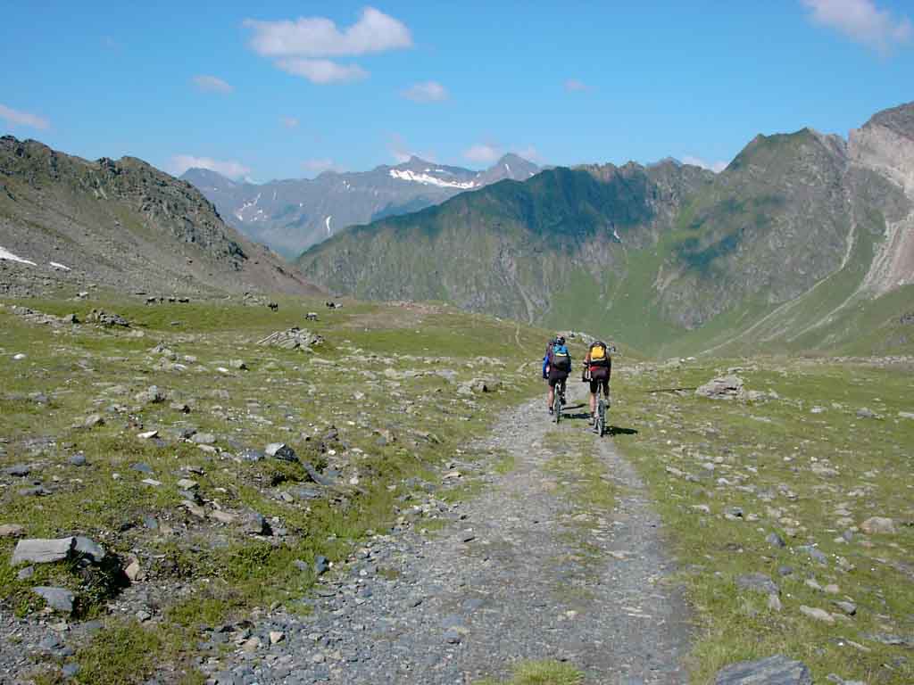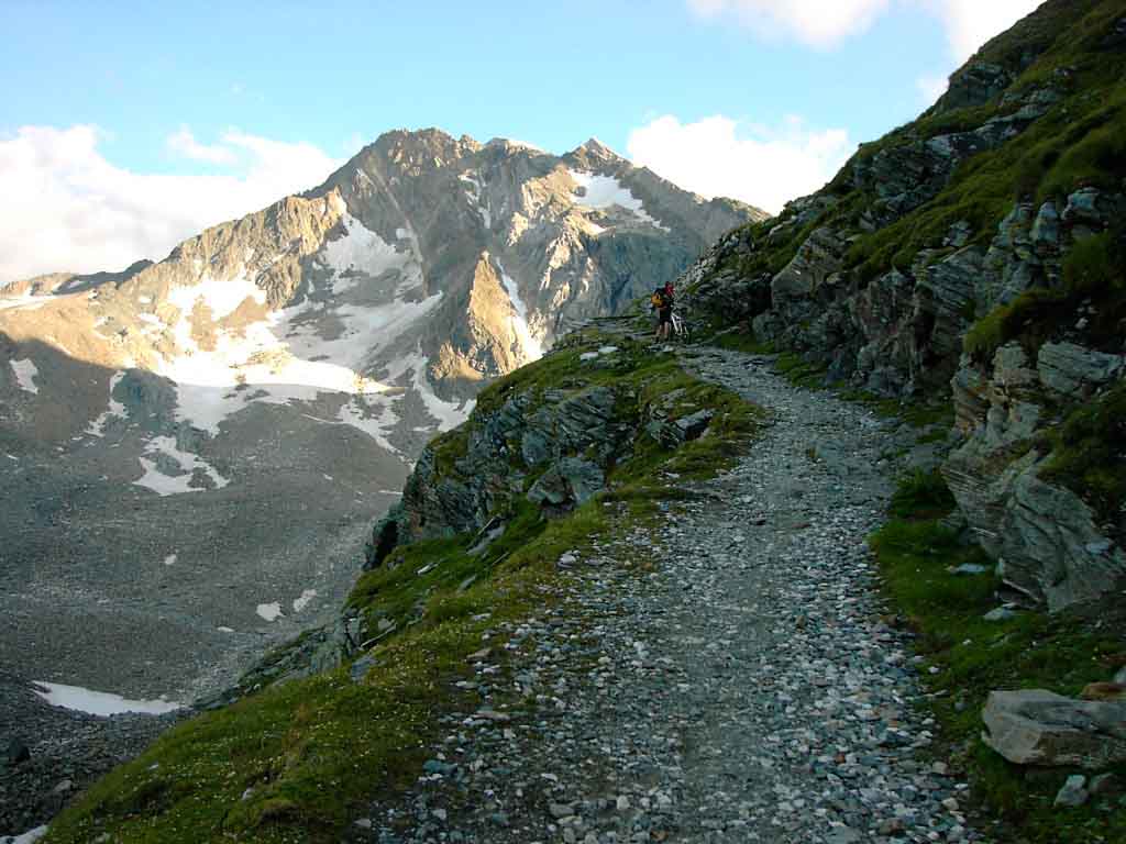 An der Alm beginnt die alte Militärtrasse zum Eisjöchl und damit eine laaange Schiebepassage für die meisten Bergradler. Bis ungefähr zur Hälfte ist stellenweise noch an fahren zu denken, danach folgt eine steilere Passage mit hohen Treppenstufen, dann folgt eine Steinwüste und eine kleine Senke, die noch sehr lange Schnee führen kann. Die letzten Meter zur Stettiner Hütte sind dann wieder fahrbar, allerdings nur wenn man es unbedingt wissen will. Insgesamt eine schöne Bergwanderung mit reichlich unhandlichem Gepäck. Aber Dank der schönen Aussicht und den noch humanen Steigungen nicht sooo schwierig. Da das Tagesziel, die Stettiner Hütte, auf ca. 2900 m Höhe liegt, sollte man aber bei ungünstigen Wetterbedingungen den Aufstieg nicht wagen, und bedenken, das im Hochgebirge schlechtes Wetter sehr schnell kommen kann und Gewitter bzw. Schneefall in 3000 m Höhe kein Spaß mit kurzen Hosen und Metallgestellen ist.