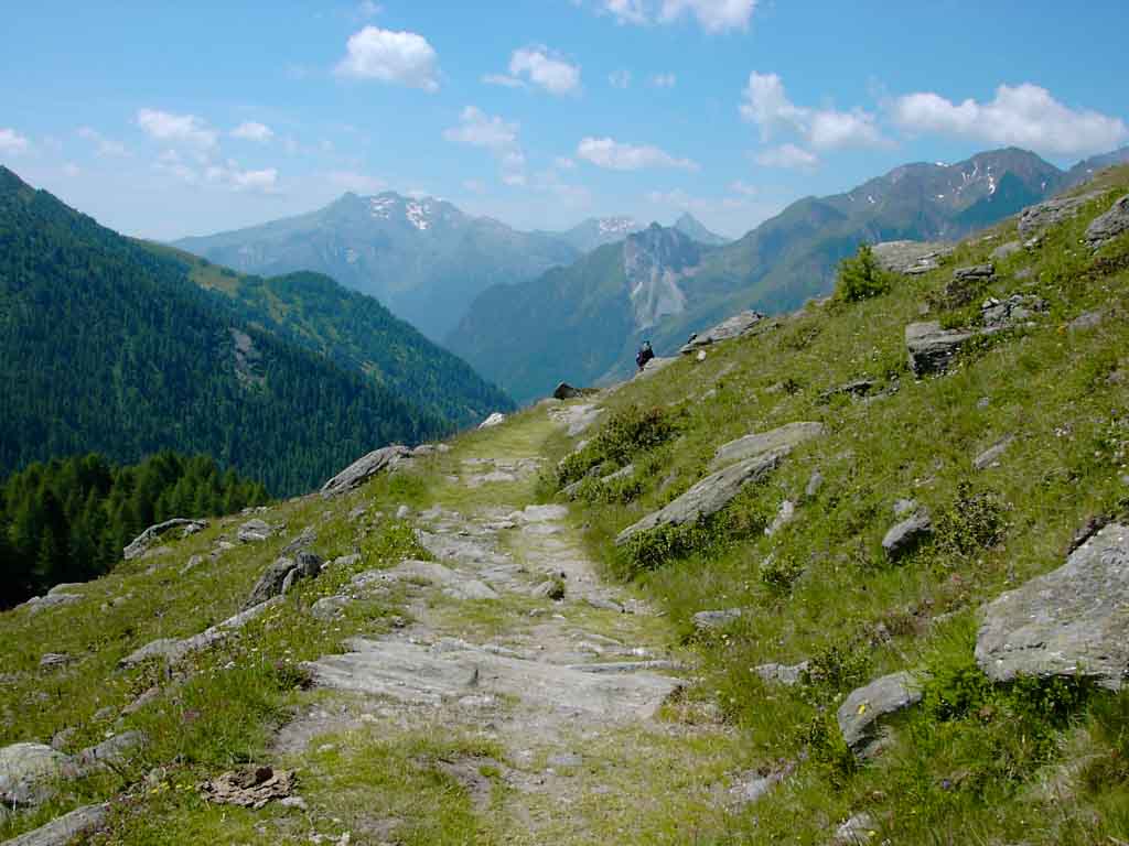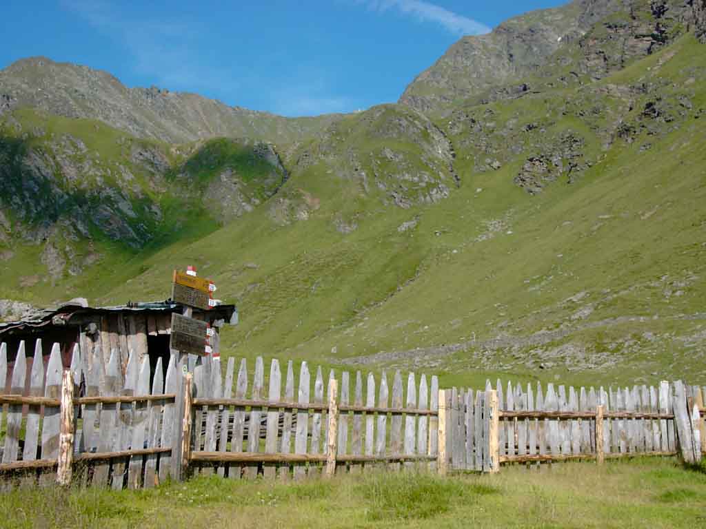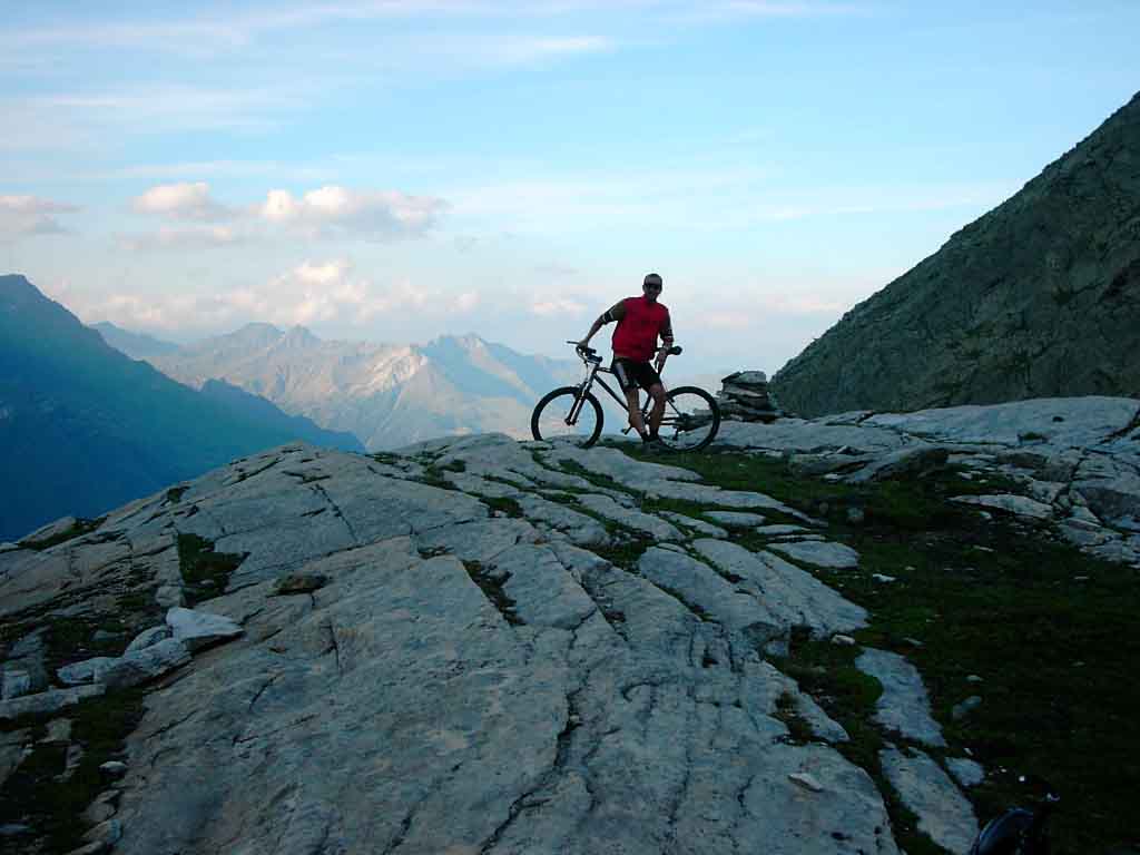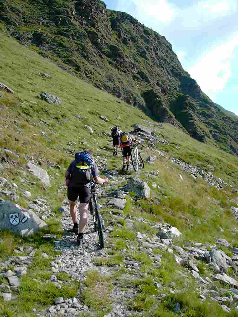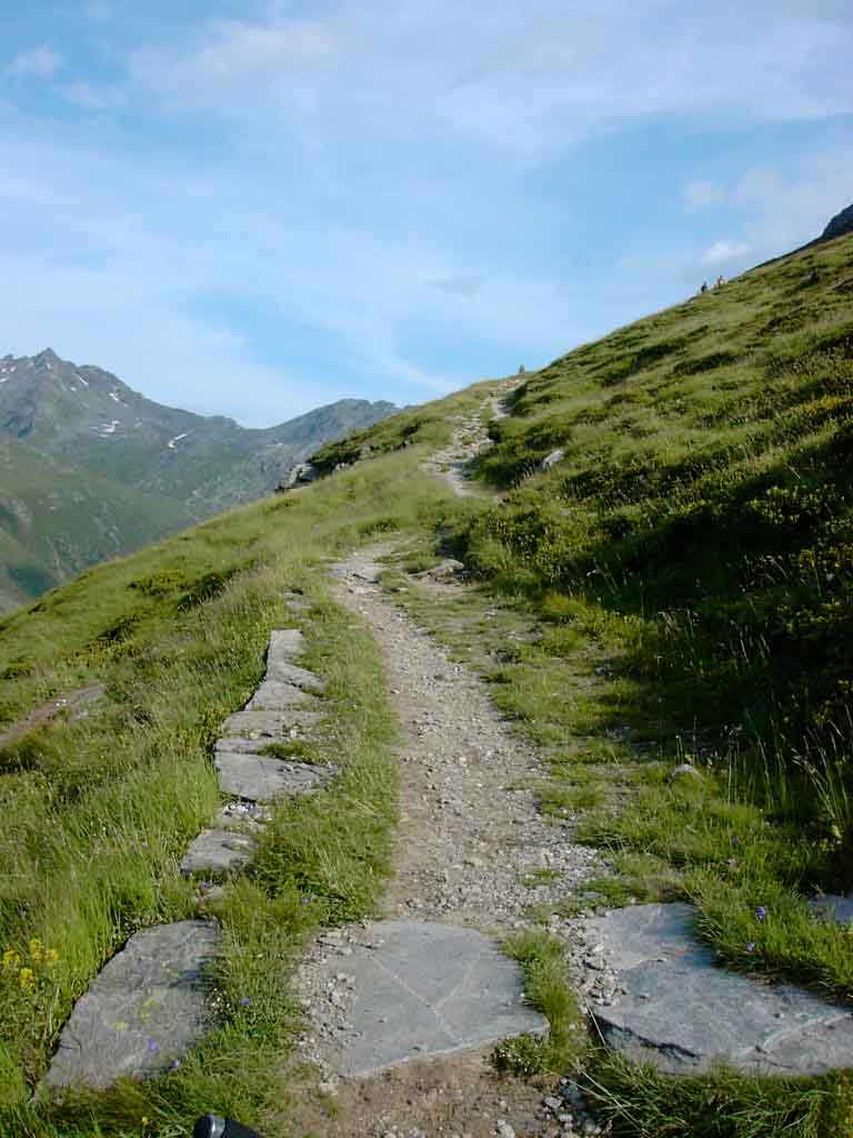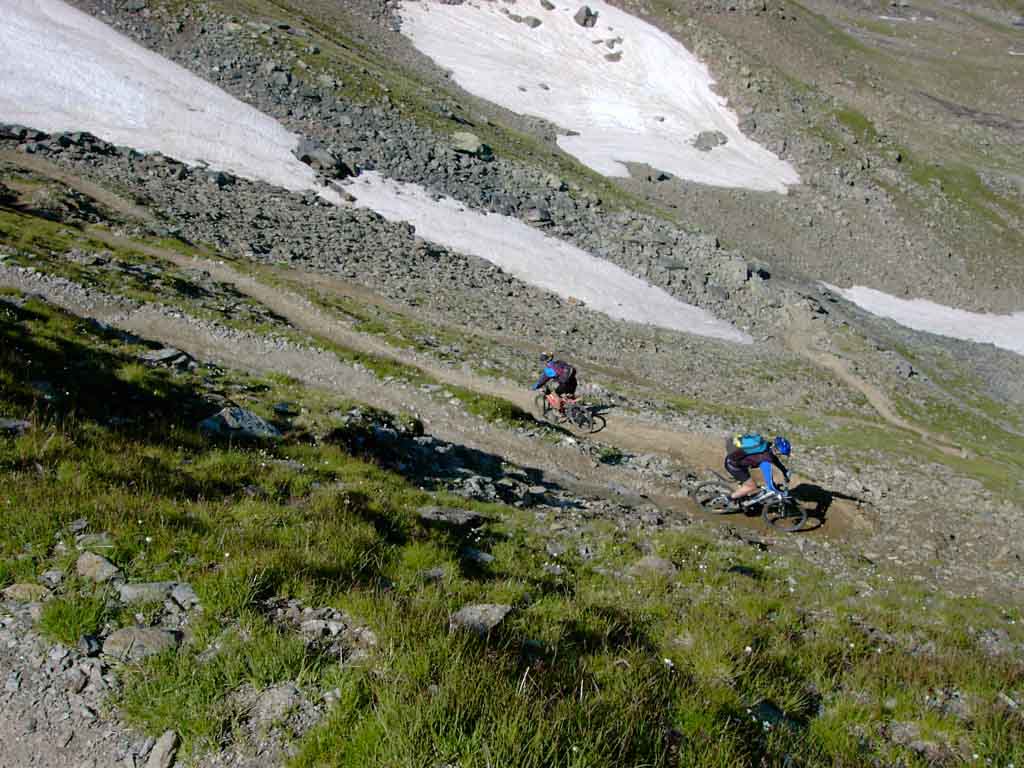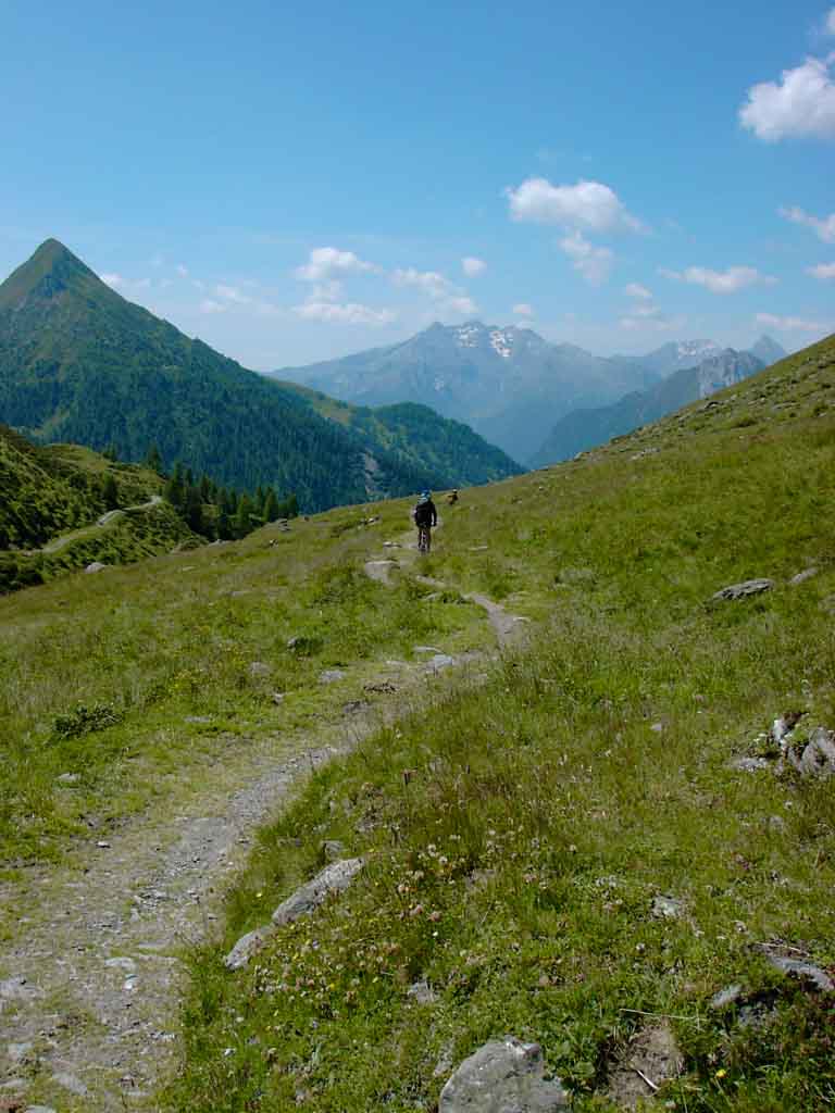 An der Alm beginnt die alte Militärtrasse zum Eisjöchl und damit eine laaange Schiebepassage für die meisten Bergradler. Bis ungefähr zur Hälfte ist stellenweise noch an fahren zu denken, danach folgt eine steilere Passage mit hohen Treppenstufen, dann folgt eine Steinwüste und eine kleine Senke, die noch sehr lange Schnee führen kann. Die letzten Meter zur Stettiner Hütte sind dann wieder fahrbar, allerdings nur wenn man es unbedingt wissen will. Insgesamt eine schöne Bergwanderung mit reichlich unhandlichem Gepäck. Aber Dank der schönen Aussicht und den noch humanen Steigungen nicht sooo schwierig. Da das Tagesziel, die Stettiner Hütte, auf ca. 2900 m Höhe liegt, sollte man aber bei ungünstigen Wetterbedingungen den Aufstieg nicht wagen, und bedenken, das im Hochgebirge schlechtes Wetter sehr schnell kommen kann und Gewitter bzw. Schneefall in 3000 m Höhe kein Spaß mit kurzen Hosen und Metallgestellen ist.