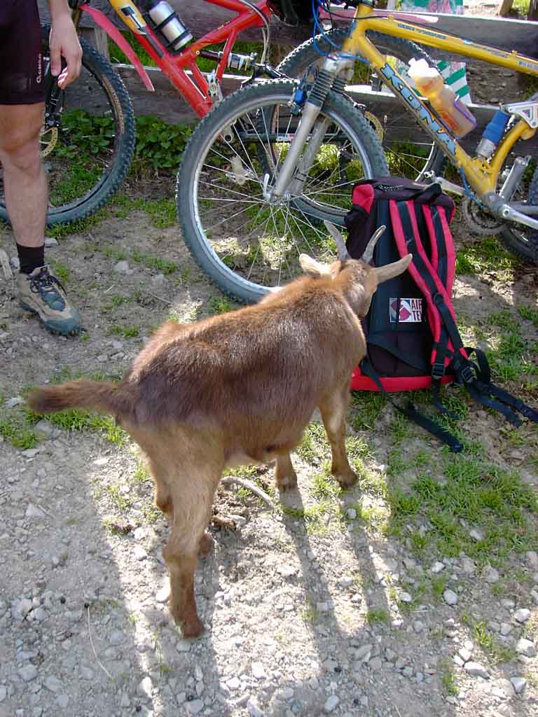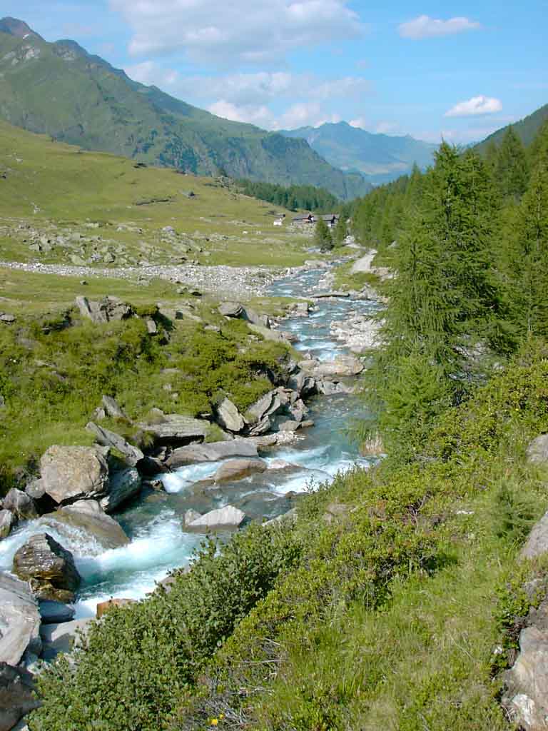 Am Ende des Knappensteigs muss noch etwas geschoben werden, bevor die Timmelsjochstrasse erreicht wird. Hier geht es auf der Asphaltstrasse erst bergab, bevor uns hinter einer Brücke der Wanderweg E5, schöner Trail immer am Fluss lang, nach Moos lockt. Da uns bald die zweite Schiebung des Tages erwartet, werden hier die Kamelbuckel und die Bäuche der Teilnehmer gefüllt. Die letzten negativen Höhenmeter werden auf dem Weg ins Pfelderer Tal vernichtet, danach geht es nur noch aufwärts, erst über Strasse, dann auf der Winterrodelbahn und Wanderwegen nach Pfelders. Hier ist die letzte Tankstelle vor dem Eisjöchl und so werden der Kioskbesitzerin ihre letzten Getränkebestände dezimiert. Prost. Ab hier ist schottern angesagt und entlang des Flusses führt der Weg bis zur Laziner Alm.