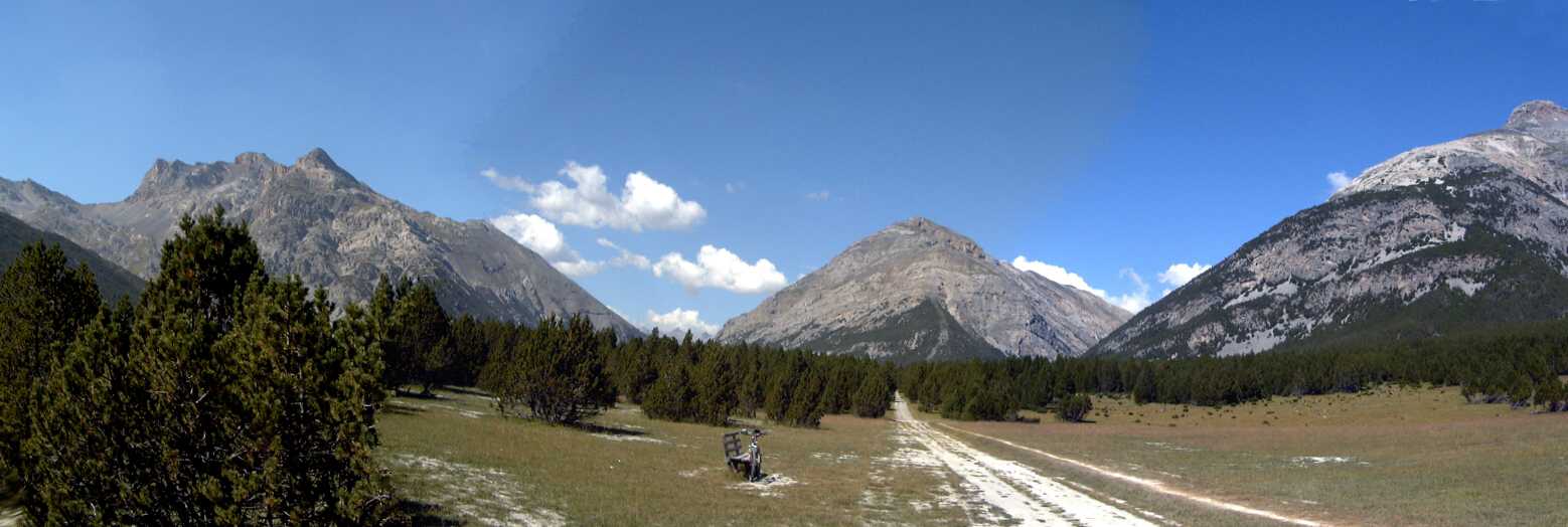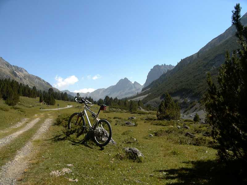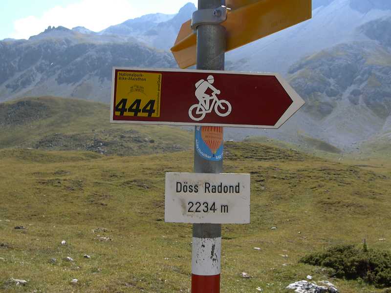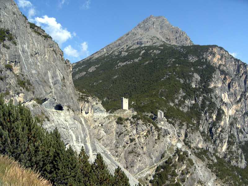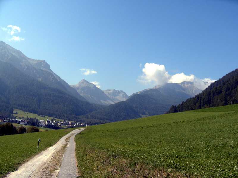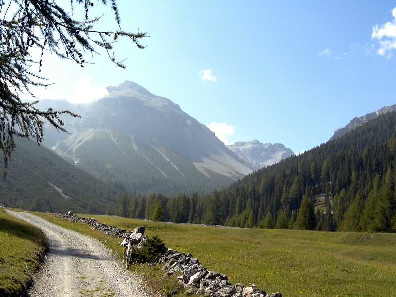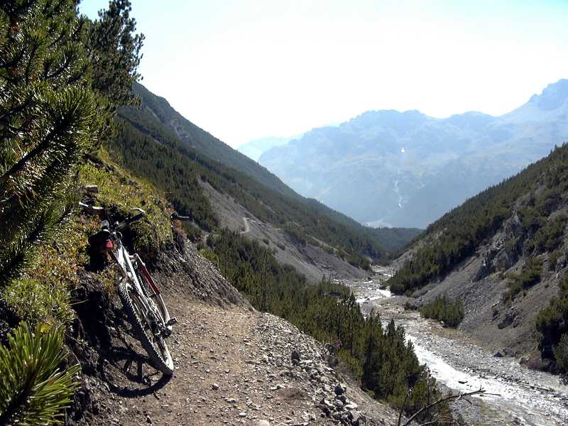 | Rechts vom Bach verläuft ein Erdweg, der bei Slingia wieder in die Asphaltstrasse mündet. In Laatsch wird der obligatorische SPAR geplündert und die Strasse in Richtung Taufers unter die Räder genommen. An der nächsten Straßenkreuzung verlasse ich den Asphalt und folge der Bikeroute links vom Bach bis kurz vor der Schweizer Grenze. Mit einem freundlichen Grüzie wird der Schweizer Grenzbewacher in trügerischer Sicherheit gewogen und man befindet sich wieder im Land von Heidi und Toblerone. Um die Hauptstrasse zu vermeiden und ein paar Höhenmeter zu sparen, biege ich kurz hinter Münster auf einen Wanderweg ab, der dem Hang bis S.ta Maria folgt. |