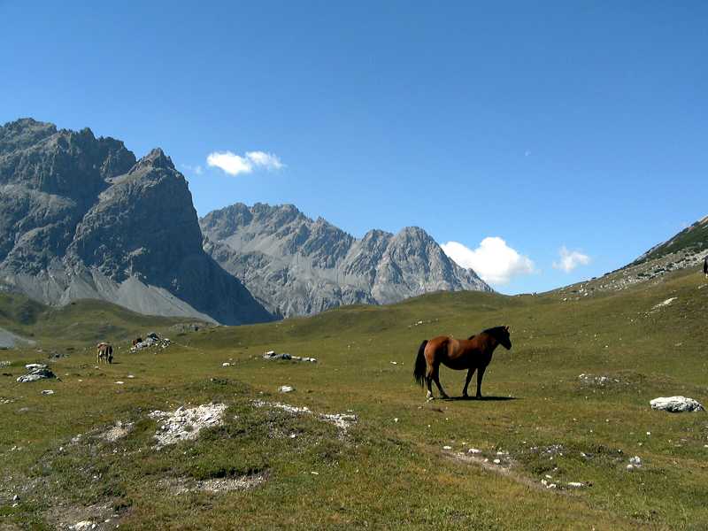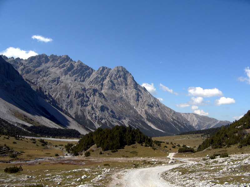 | Bei der Schotterstrecke durch das Val Vau waren die Schweizer wieder sehr sparsam und haben mit Kehren gegeizt. Man merkt sehr deutlich, das es gut bergauf geht, die Steigung wird aber am Eingang des Val Mora wieder moderater. |