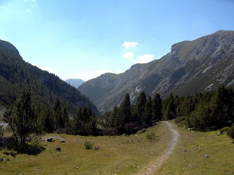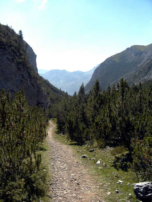 Ein Schotterstrasse führt bergab, nach der dritten Kehre verlasse ich die Strasse und biege nach Westen auf den Hangweg (Decouville) Richtung Arnoga ab. Schade nur, das das Wetter zu gut ist, die Berge sind im Dunst eingehüllt und die Aussicht muss bei klarem Wetter erstklassig sein. Die Piste ist eine breiter Schotterweg, der bis Arnoga führt. Der Einstieg ins Viola Tal ist nicht zu verfehlen. Einfach die Straße geradeaus überqueren und dem Asphaltsträsschen folgen. Die Steigung ist gut fahrbar und bald hat der Asphalt verloren und der Untergrund wird grober.