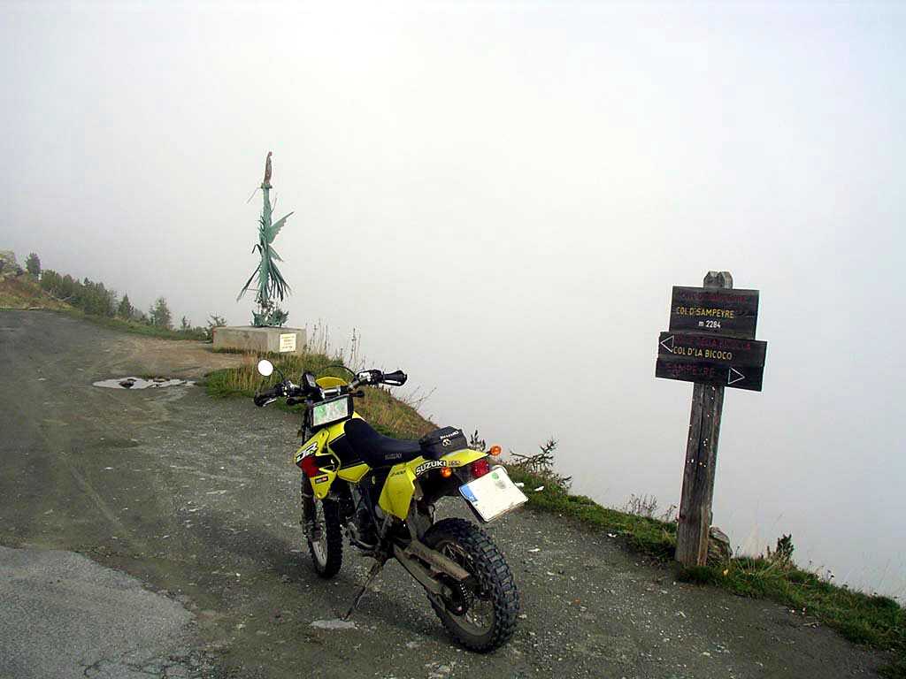 Am anderen Morgen wird das annehmbare Frühstück genossen, die Susi abgeladen und schotterfein gemacht. Das Wetter will nicht so recht mitspielen und schickt Nebel bzw. Wolken ins Varaita Tal. Egal, Hauptsache kein Regen. So fahre ich in einer weißen Wand auf den Col di Sampeyre.