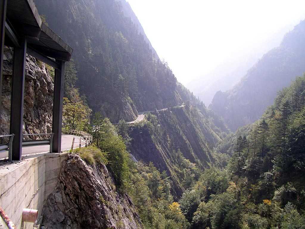 Von hieraus gibt es zwei Abfahrtsmöglichkeiten ins Maira Tal. Die Schönere ist eindeutige die Strecke durch die Elva Schlucht, teilweise knapp autobreit, immer hoch über die Schlucht mit Kurven ohne Ende.
