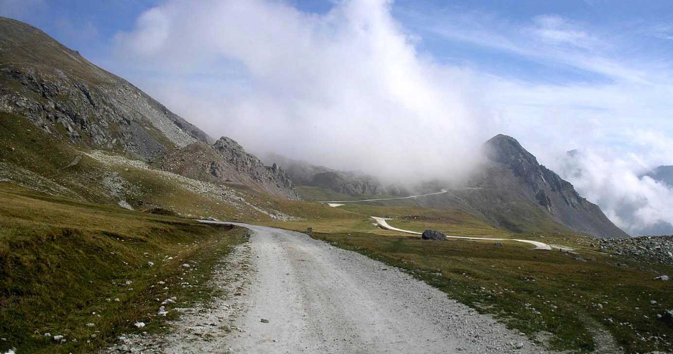 Eine Schotterstrasse führt als Sackgasse zum Col Bicocca, Petrus entschließt sich zum großen Wolkenschieben und im Norden zeigt sich der Monte Viso.