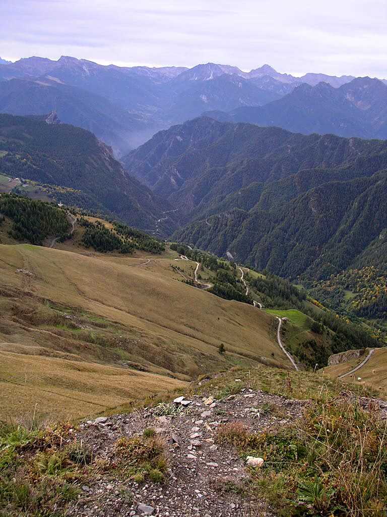 | Für mein Mountainbike gibt es am Pass keine Weiterfahrmöglichkeit und deshalb drifte ich den selben Weg zurück, schlage mich aber bald rechts in die nicht vorhanden Büsche und triale eine Schotterpiste abwärts Richtung Elva Hochebene. |