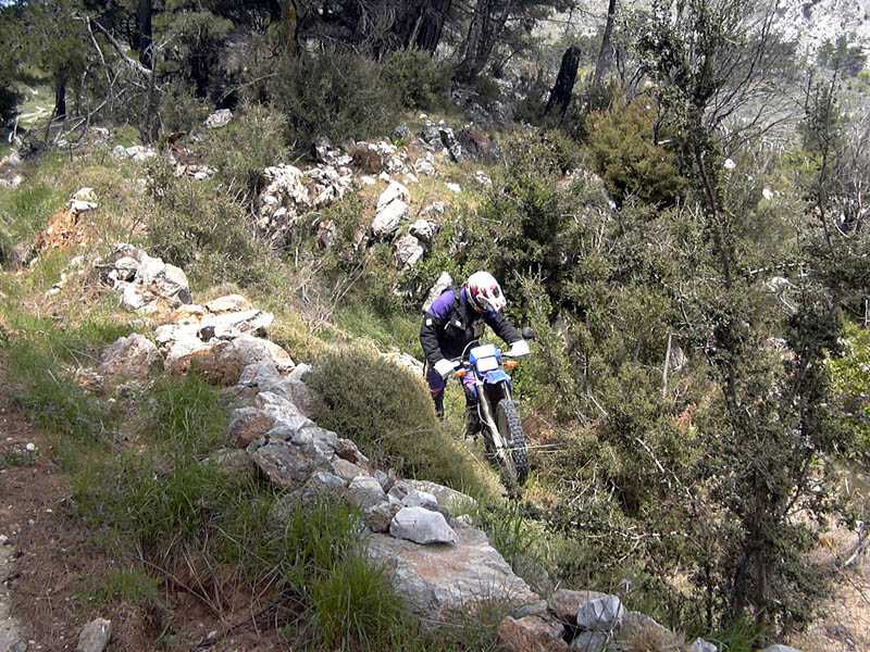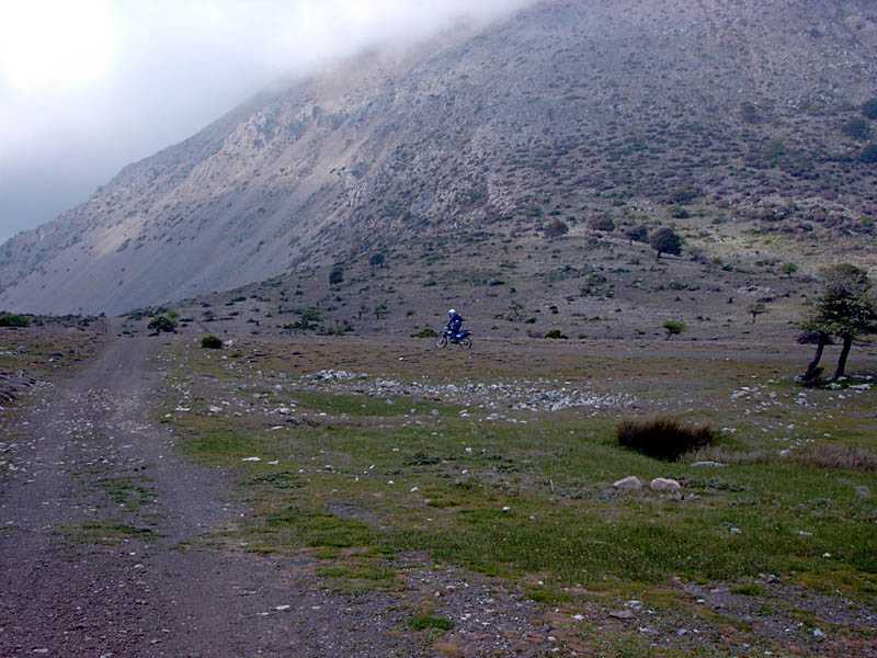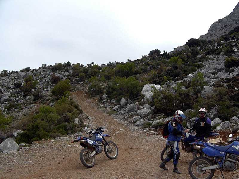 in der Nähe von Mesa Lesithi und eine mögliche Weiterfahrt über einen Wanderweg an. Mit etwas Sucherei wurde der Einstieg gefunden und eine Piste schlängelte sich den Berg rauf. Leider war mit dem Anfang des Wanderweges Schluss mit lustig. Es folgt ein schmaler Weg mit Kehren und Steinstufen, der wahrscheinlich mit entsprechenden Kupplungseinsatz oder Schiebearbeit machbar gewesen wären. Danach geht der Weg steinig, aber fahrbar weiter. Am Ende eines Tages wäre er einen Versuch wert gewesen, aber so haben wir auf Rücksicht auf Mensch und Material den Rückzug angetreten.
