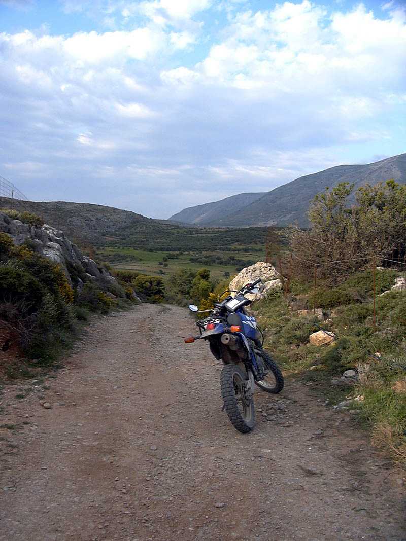 Vor dem Schotter hat der Herr leider eine Asphaltetappe vorgesehen und deshalb schrauben wir uns ab Malia Richtung Lasithiou Ebene hoch. Bei einem Orientierungstopp wird mein grüner Freund leider ein Opfer des kretischen Asphaltes und findet sich in der Horizontalen wieder. Außer ein paar Kratzern an Leib und Maschine war aber nichts passiert. Geplant war eine weiträumige Umfahrung des Diktigebirges im Osten. Die Karte bot eine Schotterpiste