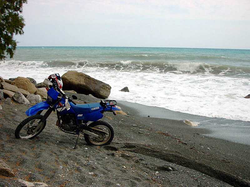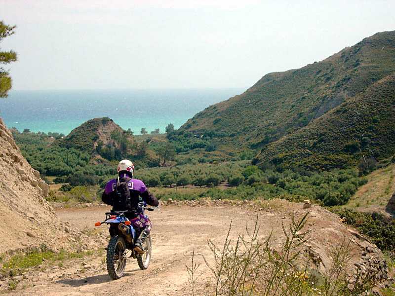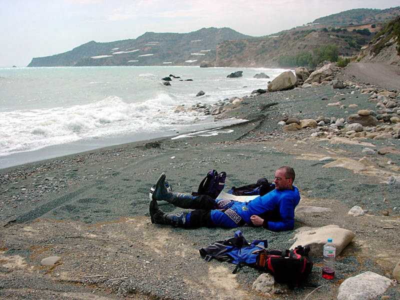 Der Asphalt hat uns wieder, die Südküste erreichen wir aber über Gdohia auf Schotter. Reichlich einsam hier und außer ein paar kleineren Orten mit Gewächshäusern ist hier nur Gegend. Feine Sandstrände sucht man hier auch vergebens, aber ein Kiesstrand kann auch die Illusion von Urlaub vermitteln. ;-). |