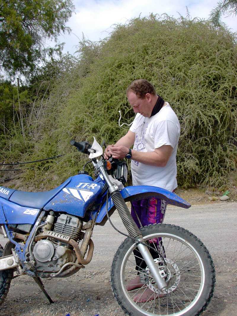 Eine Schreckminute verschaffte uns wieder der Mann in Grün, er hatte den Weg mittels Salto außerplanmäßig verlassen. Gott sei Dank waren die körperlichen Schäden nur sehr gering und die Yamaha klagte nur über einen gebrochenen Tachohalter und fehlenden E-Starterknopf, der aber provisorisch überbrückt werden konnte. |