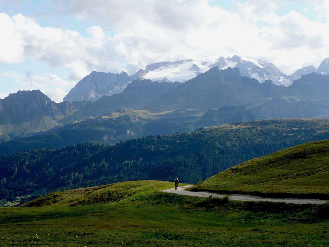 und handtuchbreite Wege mit Aussicht aufs Pordoijoch