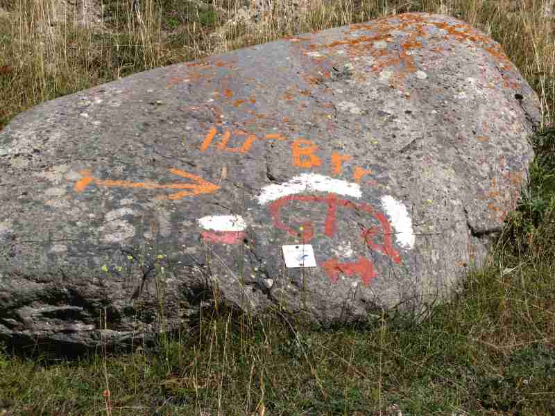 ein Wanderwegmarkierungspfahl auf. Hier ist der Abzweig zum Bassa di