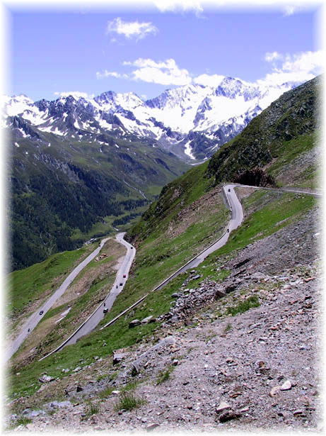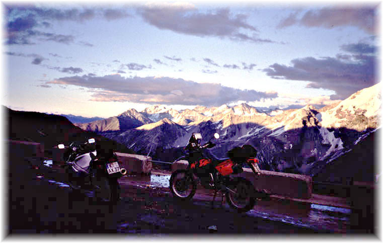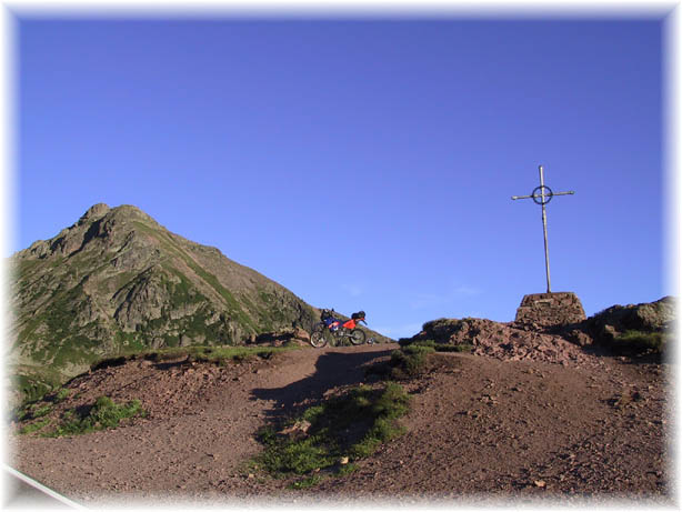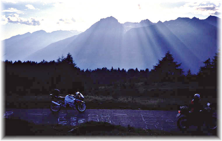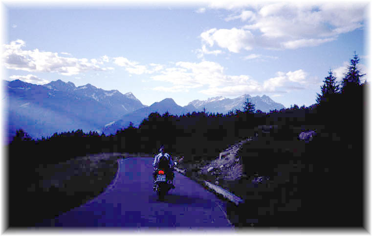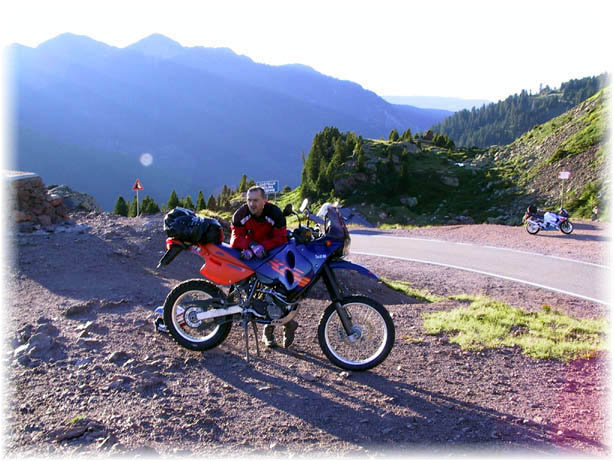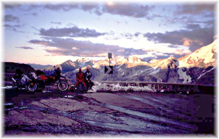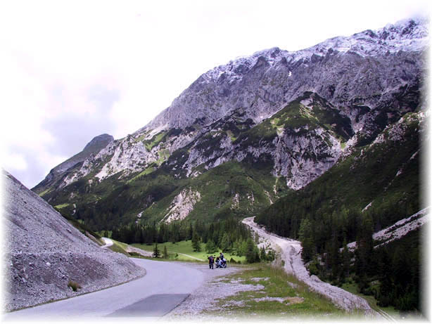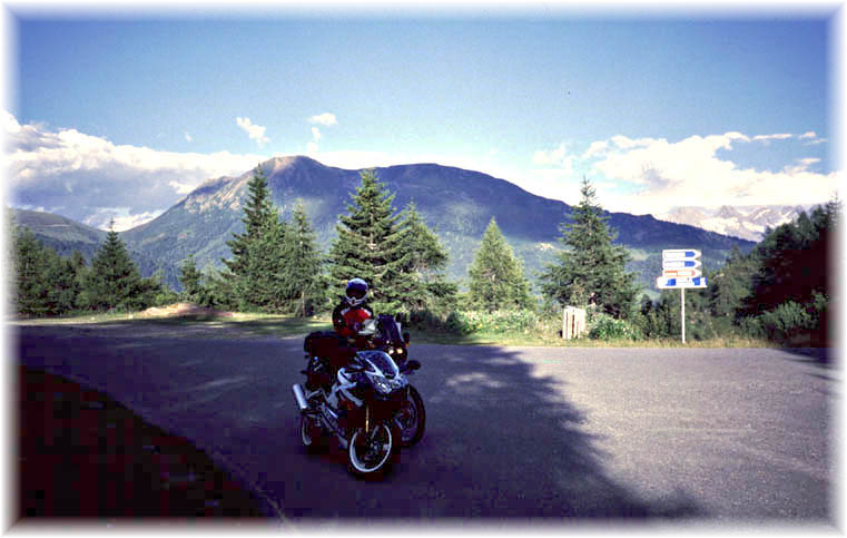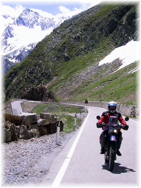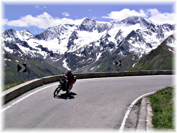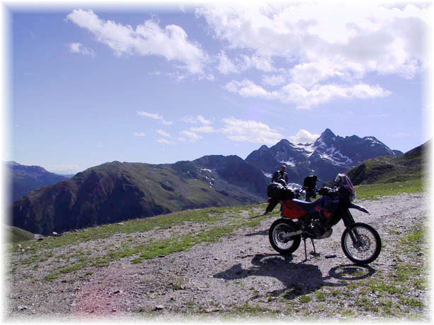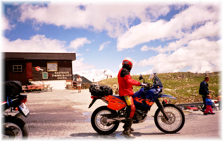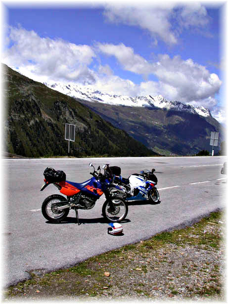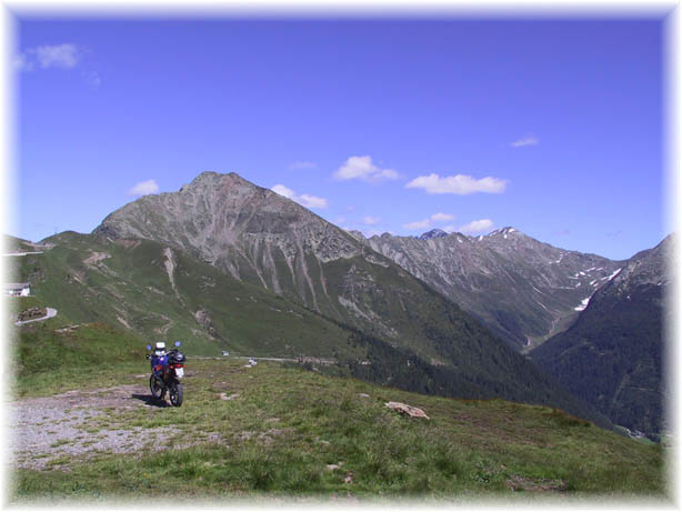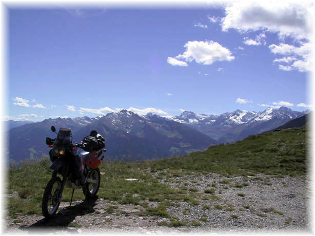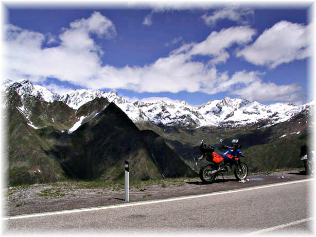Nachdem man mit dem Auto übers Timmelsjoch gefahren war und die Scharen von Mopes gesehen hatte, ward eine Idee geboren. Ein langes Wochenende in den Alpen wäre mal wieder nicht verkehrt. Noch schnell die Adventure von einem Freund geliehen und und einen anderer bequatscht, Mike B. die Tourenplanung zu überlassen und er brauchte nur hinterher zufahren, selber schuld. Ach ja, das ungleiche Paar von Suzuki 1000 mit 200 kg und 160 PS gegen KTM Adventure raufte sich doch ganz gut zusammen.
