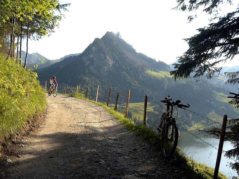 In Jaun sollte man sich mit Speisen und Getränken versorgen, es folgt der kleine, aber feine Euschelpass. Wenn man die 600 Hm bewältigt hat, gibt es kurz vor dem Pass wieder eine Verpflegungsstation. Von dort Entweder der Strasse bis zur Passhöhe folgen oder an der Alm rechts den Wanderweg ca. 5 Minuten hochschieben. Ab dem Pass beginnt eine tolle Schotterpiste Richtung Schwarzsee. Kurz unterhalb der Passhöhe steht ein Bauernhaus. Man nehme dort die rechte Umfahrung, links geht es auch, aber wieder über die allseits beliebte Kuhwiese.