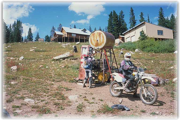 | Diese kleine Berghütte mit angeschlossener Tankstelle diente uns als Mittagsstopp. Sie gehört einem Freund von Tracy und ist doch relativ komfortabel und wird gern als Anlaufpunkt in dieser Gegend genutzt. Die US Offroad Ikone Malcom Smith, auch ein Freund von Tracy, war auch schon da. Muss ein sehr netter Typ sein. |