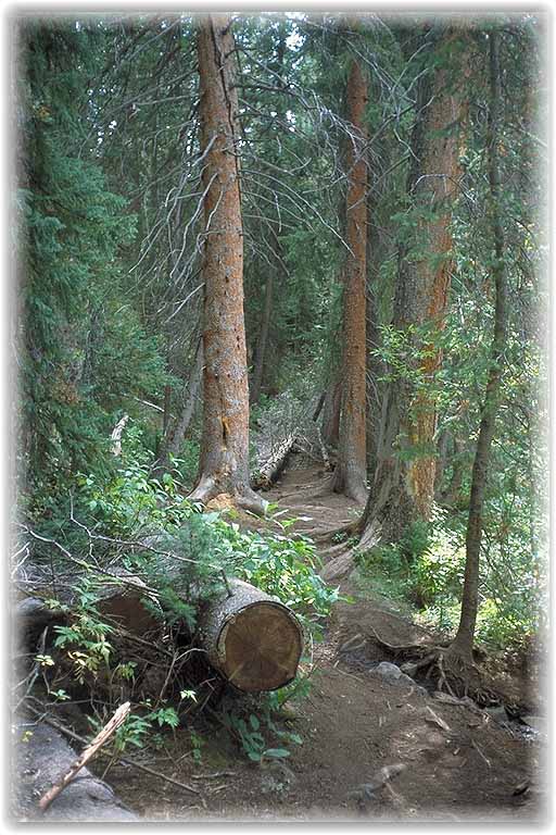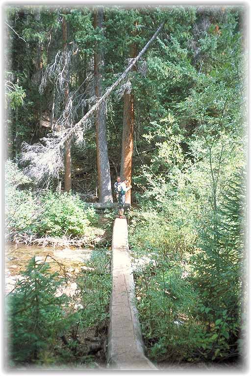 | Auch der anschließende Pack Trail bot ein Heighlight in Form einer fast endlosen Abfahrt mit feinsten Switchbacks, die selbst für ein Bike reichlich eng gewesen sind. Am Ausgang konnte man den Weg durch den Fluß oder über das kleine Brückchen wählen. |